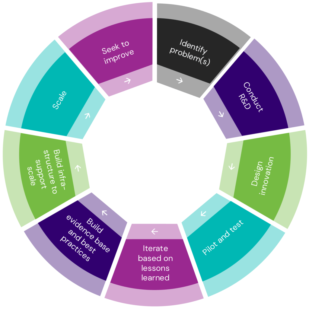 The antidote is a deliberate process that recognizes that innovation and scale aren’t the goal—and aren’t inherently superior to carefully designed pilots that build evidence about what works. The graphic to the left shows our back-of-the-envelope thinking about what that might look like. Each step serves a purpose, and the process is cyclical because improvement efforts surface new problems requiring innovative solutions. Skip steps, and you risk innovation theater.